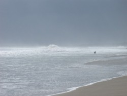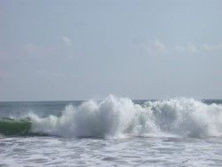 Having done the walk, we turn around and go south, and choose chaises in front of another restaurant, Ku De Ta, on which to sit – paying the appropriate fee, of course. The water is clean – very different from our only other time at the beach, on our 1st day here, when neither of us was willing to get in the water. The waves are unbelievably high – we won’t venture in very far. The only people who do go out past knee depth are attached at their ankles to surf boards, and they gladly take the risk and head out past the breaking waves, waiting for that perfect wave.