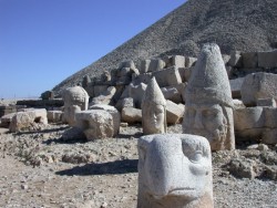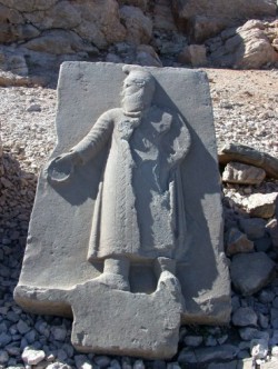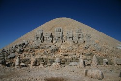 a tiny kingdom strategically placed on the Euphrates, bordered by the Roman Empire on the west and the Parthian Empire on the east. Using diplomatic and military skills, he kept both the Romans and the Parthians at bay, and protected the sovereignty of his kingdom. To shore up his rule, he declared himself to be a god, and to commemorate himself built a magnificent hierothesium (combined temple and tomb), called the Throne of the Gods, at the top of Mt. Nemrut. There is an eastern and a western terrace, and between them there is a 50 metre high man-made summit of crushed rock. Both terraces included 8 metre tall stone statues of various gods, including Antiochus – due to earthquakes, the heads of the statues on the eastern and the complete statutes on the western terrace have tumbled.