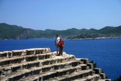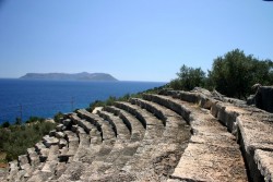 Just outside town, there is a Greek amphitheater that was later rebuilt by the Romans, situated so that the audience looks out over the sea. We climb up to the top and the whole group is entranced by the view. Just across the water is an island that, by some accident of history, is part of Greece.
