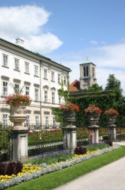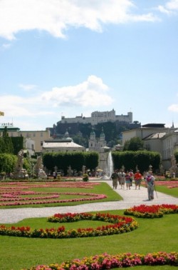 It is a gloriously sunny and clear day. We are in shorts and t-shirts but it is just a little too cool out of the sun so we bring jackets as well. Our first stop is the tourist information booth where Martin has directed us to find out about – yes –the Sound of Music tour. It is prohibitively expensive and again, even I can’t bring myself to suffer the kitschiness of it all. We wander across the street to the Schloss Mirabell and gardens and decide to do our own tour of Saint Julie of the Andrews movie. You will remember this garden as one of the gardens her saintliness sang “Doe, a deer” with those adorable children. Today it is full of tourists and workers, who are setting up an event for the Festival later this evening. The garden is actually quite lovely and has a sweeping view up to the Festung Hohensalzburg. We cannot pick out Hellbrunn but we do see the red domed bell tower of Stift Nonnberg and wander down to the Abbey. It is a beautiful chapel, quiet and completely uninhabited by tourists.