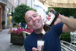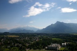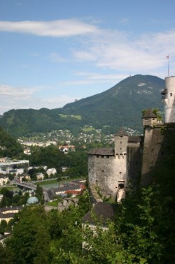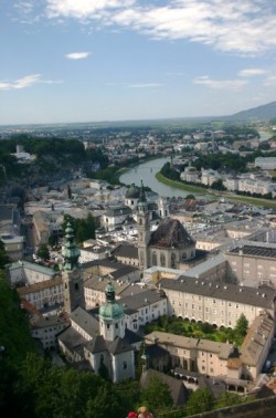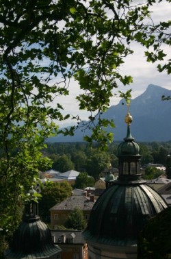 We stop for a patio lunch beside – you guessed it: The house where Mozart lived for seven years – and then continue our exploration of the city. We cross the river, stop into one of the many shops selling Mozart chocolates and John buys some marzipan and I buy some dark chocolate. We take the funicular up to the Festung Hohensalzburg and spend an hour enjoying the almost 360-degree view from high above the town. We look for Hellbrunn, the Von Trapp family Schloss (in the movie) and Stift Nonnberg, the famous convent where Maria sought refuge from her life at the beginning of the movie and from those terrible Nazis at the end. No need to remind you of all those dear, memorable songs sung at the Abbey.