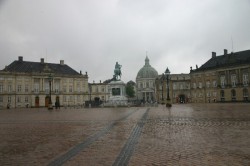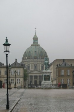 Our umbrellas are up and down during this wet, wet Copenhagen walk. Sometimes it is just a light misting, sometimes a gusty, pounding rain. We head along the harbour and turn into the Amalienborg Plats and the Amalienborg Palace, home of the royal family since 1794. The cobbled square is wet and has that flat, grey magic light that the 18th-century French painters captured so well. We move across the deserted circular square, and like many others take refuge in the Frederikskirken, the Marble Church, spending 15 minutes sitting in solitude in the cool dampness. The rain drives us back to the Rådhuspladsen and away from the Little Mermaid in the choppy harbour. Many will be disappointed that we did not visit her but we are told that she is disappointing at the best of times or weather, and always covered in gull droppings. Unpopular choices are sometimes made in life and we must live with them.