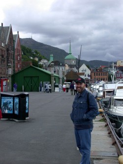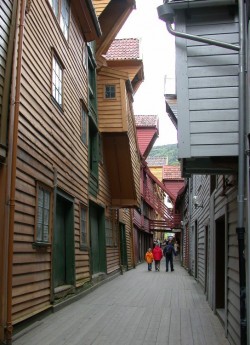 We spend the rest of the afternoon exploring Bergen, which is another very appealing city. It is about 270,000 people, but the downtown feels like it belongs to a very sophisticated city, full of beautiful squares with fountains and sculptures – possibly because this is the biggest tourist town in Norway. Bergen was one of the most important cities in the Hanseatic League, because of its beautiful harbour. Today it is this harbour that draws the ships here, and the town is full – we hear more English on the streets than we have heard since we left Toronto four weeks ago today. We walk over to Bryggen, the oldest part of town, lining one side of the harbour. Despite its appearance – we wonder how the walls stay up, they are so badly tilted – it is a very posh little area: We discover that behind the façade of falling-down-ness, are legal and accounting firms. Then we find a street being rehabilitated and realize that these buildings have been very carefully renovated, to preserve the topsy-turvy exterior in front of new, fully-modernized interiors.