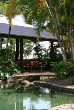 We don’t quite understand why there are so few people here – the cabins are beautiful! We have two bedrooms, excellent furniture, and our own Bang & Olufsen sound system. We head up to a good dinner at about 7:15, sitting poolside and outdoors but covered. We both have barramundi, grilled and caught within seeing distance, and salad, and watch an incredible thunderstorm start to develop over the Coral Sea, with glimpses of lightning through the palm trees heralding the thunderous booming of the rest of the storm. The rain starts gently, ever so, and then moves on to a warm, dancing torrent on the tin roof. North Queensland is tropical, and while it gets quite a lot of rain annually, most of it falls in the summer – and from the rain tonight, it would appear that “monsoon” is an appropriate description.