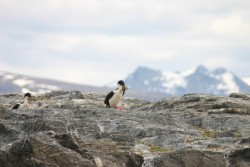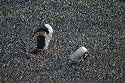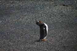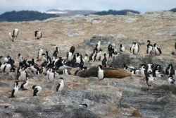 We cruise on through Mackinlay Pass and finally stop for a good half hour at the Magellan Penguin colony. We take lots of pictures here and move around the deck of the catamaran watching the antics of the penguins through the camera and our binoculars. Who knew that penguin necks (and sea lion necks, for that matter) were so flexible? At one point, we see something jumping through the water. We can’t tell what it is, but watch in fascination as it comes closer to shore. A much bigger penguin proudly emerges from the water and we realize that he is an Imperial Penguin, standing taller and with bright orange beak, feet and under-wings. He stands in one spots and continues to groom himself for the entire duration of our stay here.