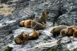A “remise” is called, to take us to the tourist dock for 3 p.m., and we board the Tolkeyen Patagonia catamaran and head out into the Beagle Channel. The cruise will get us back to Ushuaia for about 8:30. We untie and float into the channel, viewing the town from the water. We can also see the dramatic Monte Olivia from the water, knowing our hotel is at the base. The afternoon is cool and dramatically overcast. Every piece of information you read about Ushuaia tells you that the weather is very changeable here, so we are prepared for the best and the worst. Our first stop is a colony of cormorants who happen to be sharing space with the sea lions on Isla de Los Lobos (Sea Lions’ Island). The catamaran easily maneuvers the shallow waters and everyone is on deck, snapping pictures. We pass the Les Eclaireurs Lighthouse and continue sailing past the Chilean Military town of Puerto Williams, on the other side (the Chilean side) of the Beagle Channel.