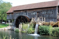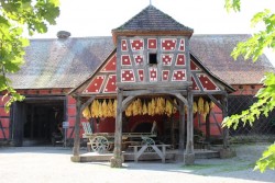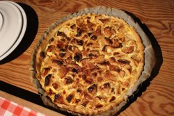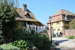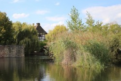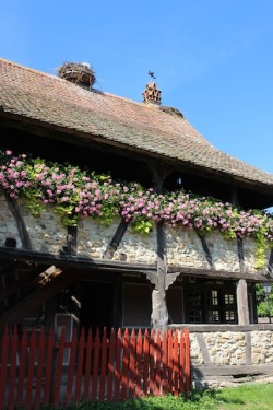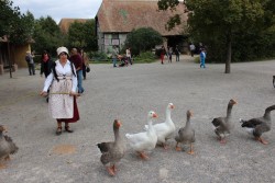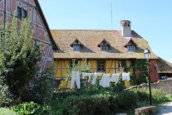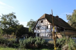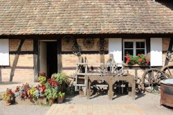 We speed up to a pleasant 80 klicks per hour on the highway, en route to Ungersheim, the roof open, the windows down and I admit to feeling less than protected as I view the highway flying by beneath my feet. We are speeding our way up the Upper Rhine to the Écomuseé d’Alsace, a French/Alsatian version of our Upper Canada Village but on a smaller scale. The Écomuseé is organized like a real village from the early 19th and 20th centuries with streets, gardens, a river and all its representative, historic buildings: homes, farms, schools, a chapel, train station, mills, and craftsmen’s workshops. We arrive and are whisked through the employee’s entrance and into period costume for our visit. Clémence has been keeping this a secret since our arrival four days ago. Our challenge today is to create some typical, period food: Artepfel Kierla (essentially potato latkes) et un Tarte aux Pommes! We set to peeling, chopping, squeezing and measuring as chatty tourists drop into the kitchen, appropriately name the House of Tastes and Colours, and offer their own versions and critiques of the recipes we are re-creating.